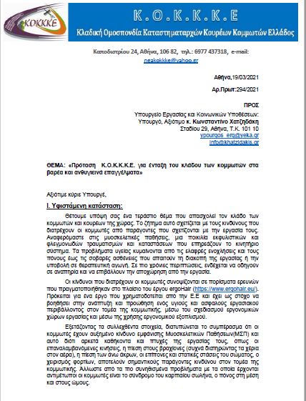 Έγγραφο αίτημα στον Υπουργό Εργασίας και Κοινωνικών Υποθέσεων κ. Κωνσταντίνο Χατζηδάκη απέστειλε η Κ.Ο.Κ.Κ.Κ.Ε ζητώντας την ένταξη του κλάδου των κομμωτών στα βαρέα και ανθυγιεινά.