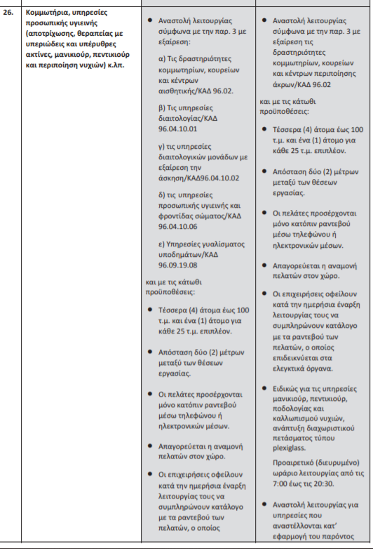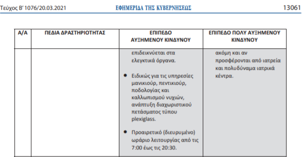 Η απόφαση ισχύει από το Σάββατο, 20 Μαρτίου 2021 και ώρα 6:00 έως και τη Δευτέρα, 29 Μαρτίου 2021 και ώρα 6.00 με την επιφύλαξη της λειτουργίας ανοικτών (υπαίθριων) αρχαιολογικών χώρων, κομμωτηρίων, κουρείων και κέντρων περιποίησης άκρων του επιπέδου πολύ αυξημένου κινδύνου των σημείων 12 και 26 του πίνακα της παρ. 1Β του άρθρου 1 που επιτρέπεται υπό τις προϋποθέσεις της παρούσας από τη Δευτέρα, 22 Μαρτίου 2021.